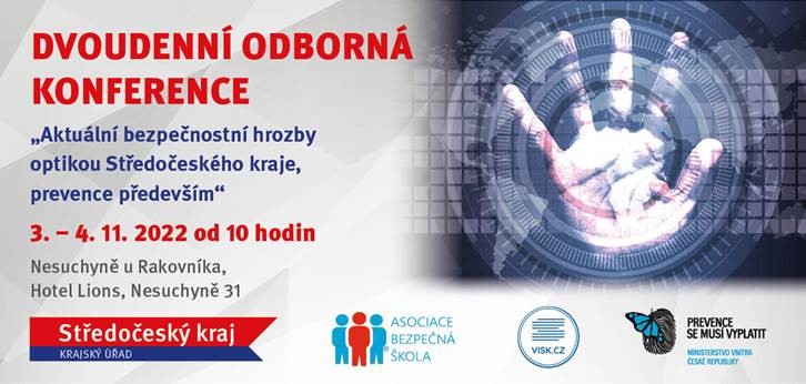 Ve dnech 3. – 4. listopadu 2022 pořádá Středočeský kraj Odbor bezpečnosti a krizového řízení KÚSK, Asociace bezpečná škola z. s. a Vzdělávací institut Středočeského kraje konferenci Aktuální bezpečnostní hrozby optikou Středočeského kraje, prevence především.